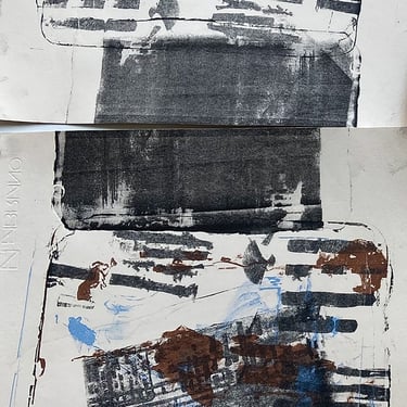 "Bureaucracy I", artwork series. litography, 2024, "Bureaucracy II", Thermal paper heated with a hair dryer and other various utensils (The paper are receipt rolls from my part-time job at the time), "Bureaucracy III", book made out of binder sleeves, 2024